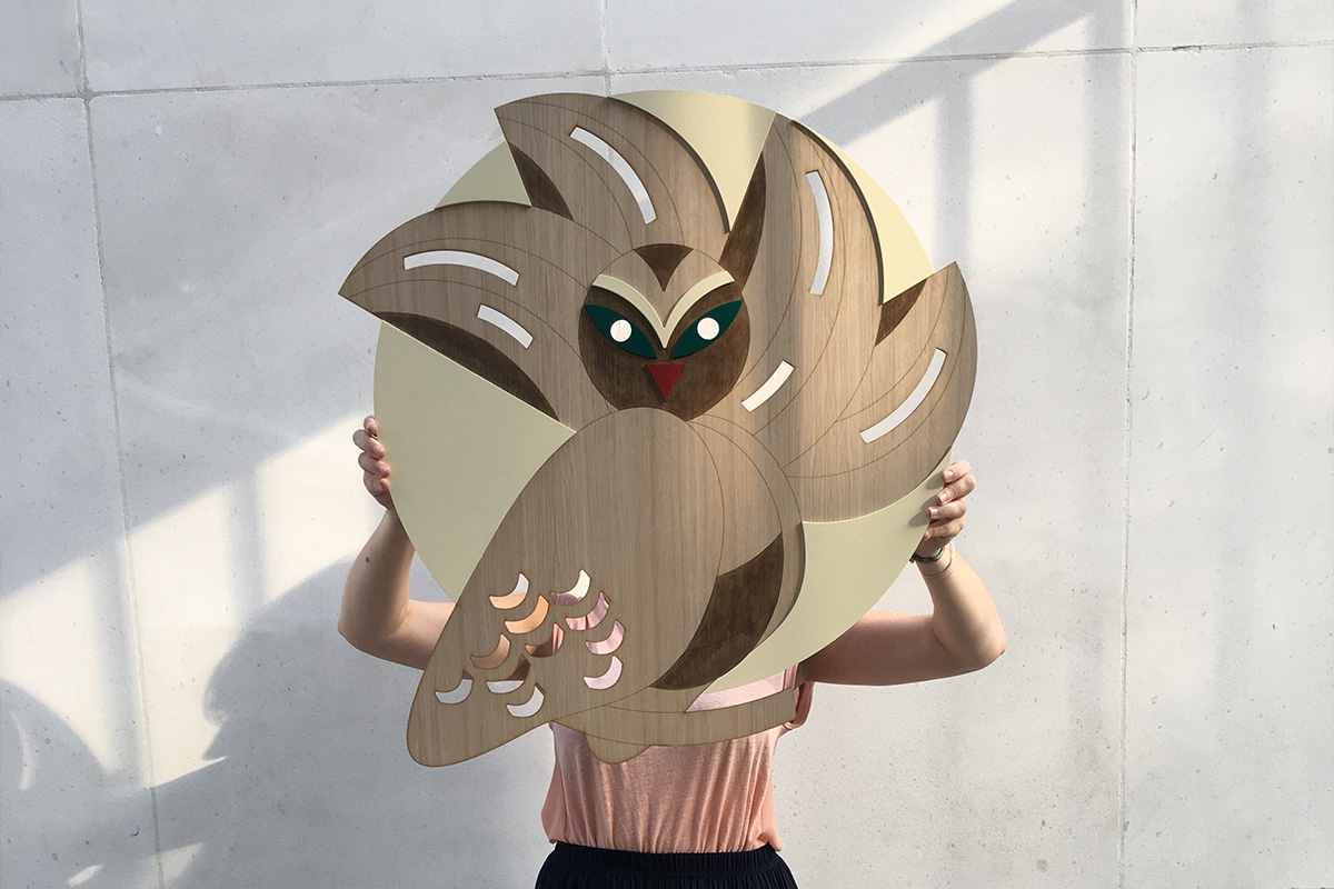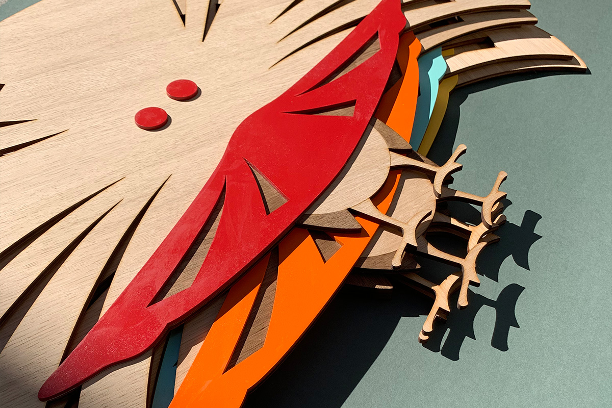 Bois découpé et gravé au laser puis peint et vernis à la main. Décorations murales aux formats variés, de 40 cm à 94 cm. En collaboration avec Gaëlle Correa (illustration) et l’Agence Terrones (architecture)